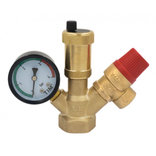 Группа безопасности котла предназначена для автономных систем водяного отопления и ГВС мощностью до 44 кВт и давлением до 10 бар. Включает в себя смонтированные на латунном никелированном корпусе предохранительный клапан с фиксированной настройкой 3 бара, манометр и автоматический воздухоотводчик. Устанавливается на линии подачи теплоносителя от котла.