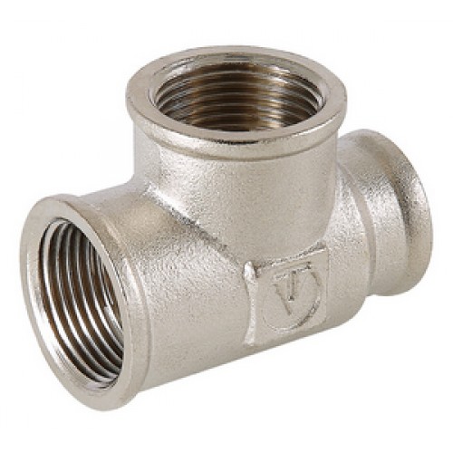 Резьбовой фитинг – тройник переходной с внутренней резьбой. Уникальная комбинация присоединительных патрубков позволяет смонтировать участок трубопровода соответствующей конфигурации без дополнительных соединителей. Фитинг изготовлен методом горячей штамповки из латуни CW617N, никелирован. Резьбовые фитинги VALTEC без резиновых уплотнителей допускается использовать при температуре рабочей среды до 250 °С (максимальное рабочее давление при этом составляет 2,7/1,7 бара – для моделей c условным диаметром до/более 1” соответственно).