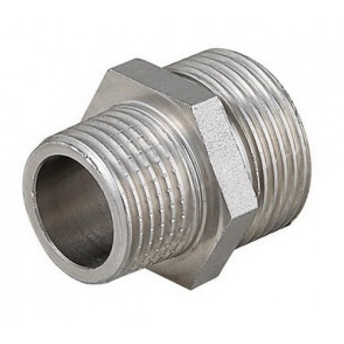 Ниппель VTr.580.N с переходом на другой диаметр резьбового соединения используется для соединения элементов трубопровода разного диаметра на трубопроводах холодного, горячего водоснабжения, водяного отопления, сжатого воздуха, иных газов и жидкостей, неагрессивных к используемым материалам, с температурой до 120 °С. Фитинг выполнен методом горячего прессования из качественной сантехнической латуни, никелирован. Могут применяться на трубопроводах из различных материалов. Резьба – наружная/наружная, цилиндрическая трубная по ГОСТу 6357 (ISO 228, EN 10226). Предусмотрен участок корпуса шестигранной формы, под гаечный ключ.