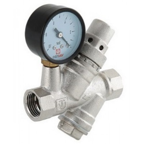 Редуктор давления VT.082 предназначен для регулируемого снижения давления рабочей среды в сетях холодного и горячего водоснабжения при вводе водопровода в квартиру. Регулирование происходит по схеме «после себя». Редуктор снабжен манометром, который позволяет производить точную настройку выходного давления и дает возможность контролировать давление при водоразборе. Для защиты поршневых уплотнений и внутренней импульсной линии редуктор совмещен с косым фильтром механической очистки с размером ячейки 200 мкм. Пробка косого фильтра имеет ушко для пломбировки. В конструктивном плане редуктор выполнен пружинным, поршневым, регулируемым. Настройка и регулировка выходного давления производятся с помощью отвертки с плоским шлицем. Редуктор полностью ремонтопригоден, любой его элемент может быть отремонтирован или заменен. Редуктор рекомендуется устанавливать сразу после входного крана, перед водосчетчиком.