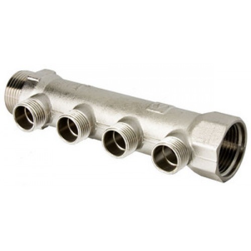 Латунный никелированный коллектор на 2, 3 или 4 выхода диаметром 1/2" с наружной резьбой. Диаметр коллектора – 3/4 или 1", резьба – внутренняя/наружная. Рабочая температура теплоносителя – до 130 °С, давление – до 16 бар. Применяется для распределения потоков жидкостей в контурах теплого пола, радиаторного отопления, холодного и горячего водоснабжения.