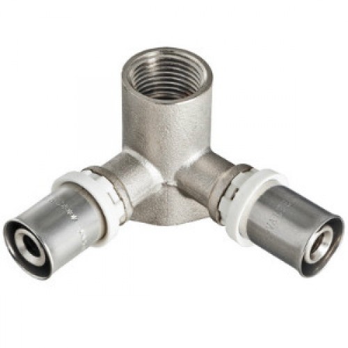 Угловой пресс-фитинг-тройник с креплением (проходная водорозетка) предназначен для присоединения к металлопластиковым (металлополимерным) трубам и трубам из сшитого полиэтилена элемента системы, имеющего наружную резьбу. Резьба фитинга – внутренняя трубная по ГОСТу 6357.