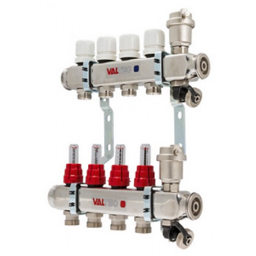 Коллекторные блоки для распределения теплоносителя по петлям теплого пола или по приборам отопления. Выходы подающего коллектора укомплектованы ручными регулировочными клапанами с расходомерами, обратного – ручными запорными клапанами, на которые можно установить электротермические сервоприводы. Каждый коллектор имеет автоматический воздухоотводчик и дренажный клапан. Материал корпуса – нержавеющая сталь AISI 304, фитинги, детали термоклапана, корпус воздухоотводчика выполнены горячим штампованием их латуни CW617N, уплотнительные кольца, золотниковые прокладки клапанов – из EPDM 70Sh. Количество выходов – от 2 до 10 (11, 12 – под заказ), рабочее давление – 8 бар, рабочая температура – 90 °С. Условный диаметр коллекторов – 1". Резьба выходов – наружная, 3/4". Присоединение циркуляционных петель осуществляется с помощью фитингов стандарта «евроконус». На всю продукцию VALTEC установлен 7-летний гарантийный срок.