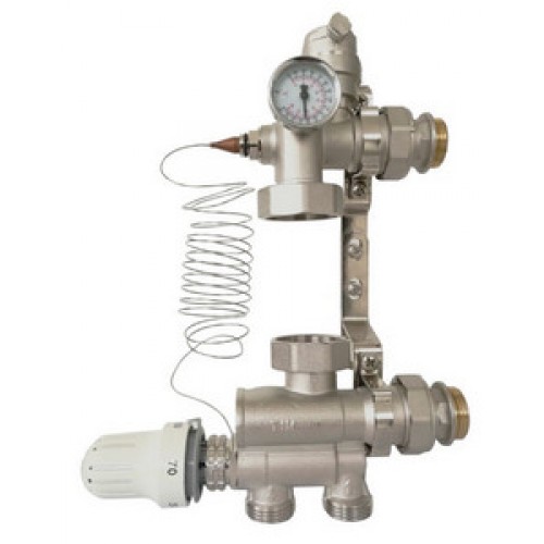 Насосно-смесительный узел для систем отопления (в комплекте: термоголовка, термометр, датчик температуры), с возможностью регулировки установочного расстояния., предназначен для создания низкотемпературных систем отопления (типа "теплый пол"). Монтируется непосредственно на коллекторной группе низкотемпературного контура и подключается к высокотемпературному контуру системы отопления.