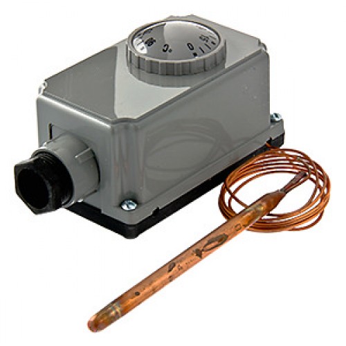 Термостат с погружным датчиком температуры, присоединенным с помощью капиллярной трубки. Применяется для поддержания в заданном диапазоне температуры теплоносителя в климатических системах, а так же в качестве предохранительного термостата.