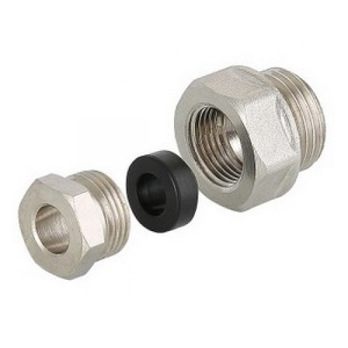 Переходник включает в себя футорку, прижимную втулку и концевую обжимную резиновую манжету. Футорка и втулка выполнены из никелированной латуни CW617N, манжета – из эластомера EPDM Sh70.