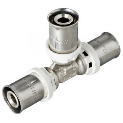 Пресс-фитинг – тройник предназначен для соединения трех труб – металлопластиковых либо из сшитого полиэтилена. Корпус выполнен из сантехнической латуни марки CW617N, уплотнительные кольца штуцеров – из EPDM плотностью 1,22 г/см3, пресс-гильзы – из нержавеющей стали. Нейлоновая обойма выполняет функции фиксатора гильзы, направляющей для пресс-насадок и диэлектрической прокладки, прерывающей контакт между алюминием трубы и латунью корпуса. Конструкция пресс-фитингов VALTEC обеспечивает повышенную пропускную способность, надежность соединений, прочность и термостойкость. Монтаж фитинга производится пресс-инструментом с насадкой «ТН». Типоряд содержит равнопроходные и переходные пресс-тройники.
