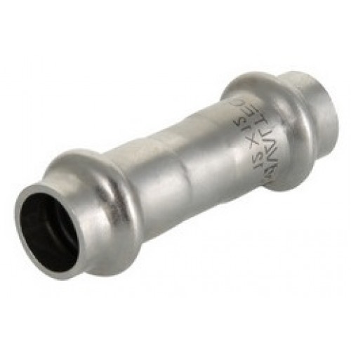 Двухраструбная пресс-муфта из нержавеющей стали предназначена для соединения тонкостенных стальных труб в системах водоснабжения, отопления, других инженерных и технологических установках с рабочей температурой до 95 °С. Номинальное давление – 16 бар. Муфта VTi.903.l изготовлена из стали AISI 304. Материал уплотнительных колец – эластомер EPDM Sh70. Достоинством бесштуцерных соединителей является малый коэффициент местного сопротивления (сужение канала практически отсутствует). Фитинг рассчитан на обжатие с помощью пресс-инструмента V-профиля.