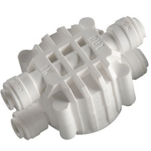 Автопереключатель (4-х ходовой клапан дренажа автоматический затворный 1/4 дюйма) служит для переключения потока воды при наполнении накопительного бака в установках обратного осмоса Гейзер Престиж, Гейзер Аллегро и системах обратного осмоса других производителей. Применяется для автоматического выключения системы обратного осмоса в случае закрытия крана чистой воды и полного заполнения накопительной емкости, а также для включения системы при открытии крана. Данное устройство предотвращает попадание сбрасываемой в канализацию грязной воды обратно в систему, а также очищенной воды - из бака в фильтр. Служит также для защиты мембраны от холостого тока воды. Клапан состоит из корпуса, изготовленного из пластика пищевого класса, двух резиновых мембран разного диаметра, штока и оснащен цангами для подключения диаметром ¼ дюйма «John Guest». Надписи на клапане соответствуют направлению воды (In – вход воды после картриджей, Out – выход воды на мембрану). Переключатель потоков обеспечивает бесперебойную работу водоочистительной системы.