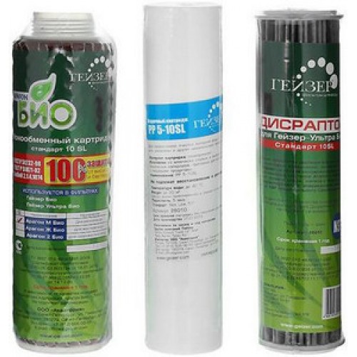 Комплект картриджей Гейзер для фильтров Гейзер-Ультра БИО 411. Подобраны картриджи стандарта 10 SL, обеспечивающие комплексную очистку воды с двойной защитой от бактерий, вирусов, их цист. Подобранные модули способствуют минерализации воды, так как специально разработаны для воды с низким содержанием солей кальция и магния.
