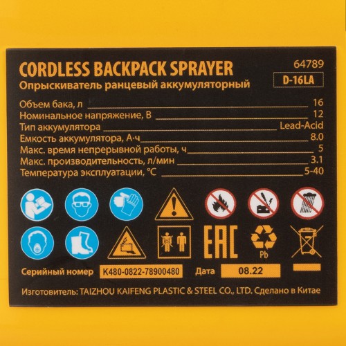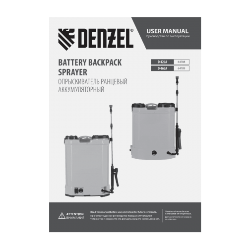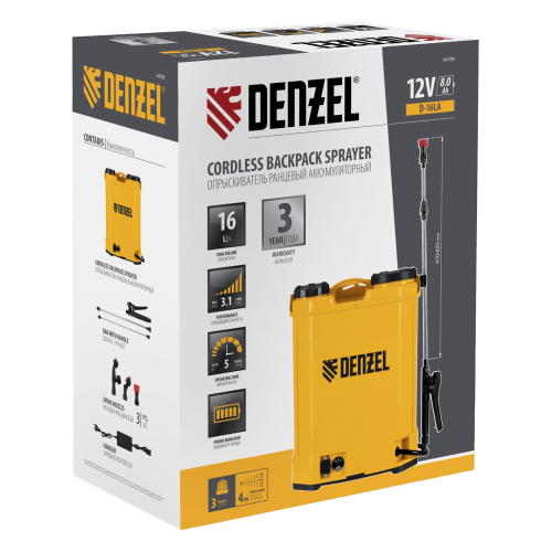 Опрыскиватель ранцевый аккумуляторный DENZEL D-16LA, 16 л, щелочной акк., 12 В, 8 Ач