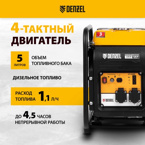 Инверторный генератор DENZEL GT-3500iF, 3.5 кВт, 230 В, бак 5 л, ручной старт