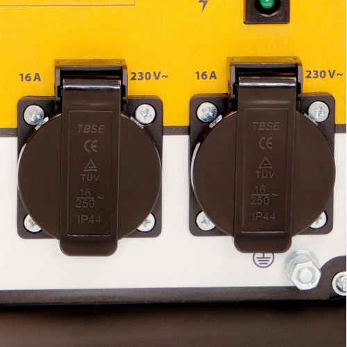 - Визуальный контроль — индикаторы на передней панели информируют о работе генератора, недостаточном уровне топлива и о перегрузке.