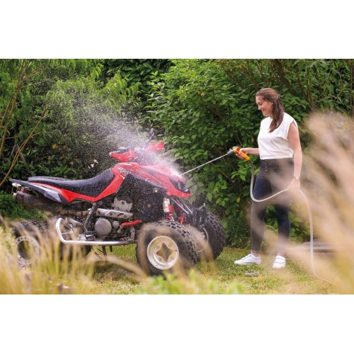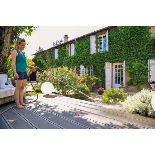 Плавное управление потоком позволяет быстро регулировать количество распыляемой воды – двигайте регулятор большим пальцем вперед для максимальной мощности струи или возвращайте его назад, чтобы сократить расход воды до 50%. Выбирая режим струи высокой мощности для очистки или деликатный полив цветов, вы можете настроить поток воды отдельно для каждой задачи по поливу или очистке, а также бережно поливать хрупкие растения.