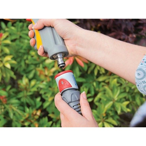 Система тройной фиксации гарантирует надежность соединения, которая сохраняется при давлении до 10 бар. Коннектор легко использовать, даже если он влажный, этому способствуют две мягкие нескользящие накладки. Плотно сцепляется со шлангом благодаря зубчикам, зажимающим внутреннюю и наружную стороны шланга. Перегибы шланга, повреждения и утечки в точке соединения с фитингом практически исключены, благодаря оригинальному гибкому хвостовику. Все внутренние детали выполнены из сверхпрочных технических пластмасс, обеспечивающих длительный срок службы с сохранением герметичности.