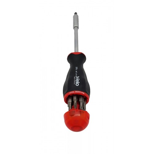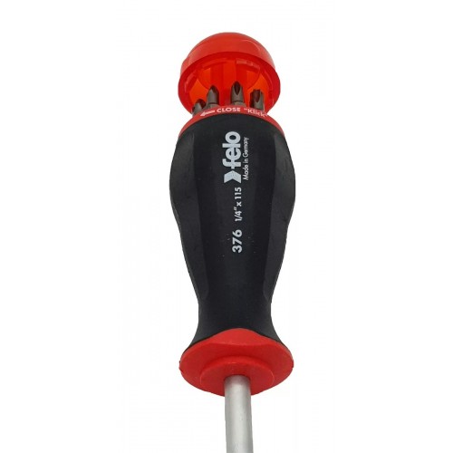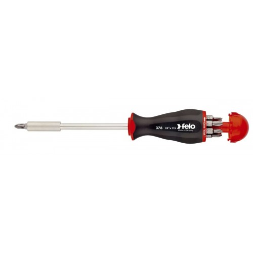 Универсальная отвёртка FELO с удлинённым стержнем, содержащая в комплекте 8 различных бит-насадок. Используется для монтажно-демонтажных работ с различного рода крепежом. Рукоятке имеет магазин с восемью битами различных типов. Смена насадок очень проста. Открытие или закрытие магазина происходит поворотом крышки на рукоятке. Все биты-насадки изготовлены из высококачественной хром-молибден-ванадиевой стали. Прочная двухкомпонентная рукоятка обеспечивает великолепную эргономику в работе