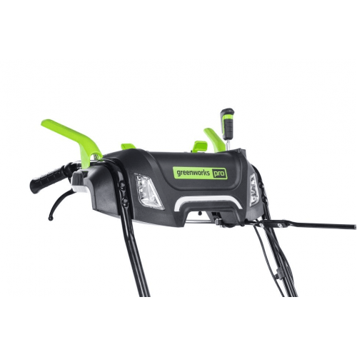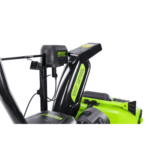 Эта модель – первый самоходный снегоуборщик в линейке техники Greenworks, он имеет 3 передних и одну заднюю скорость, а также оснащен системой разворота на месте Zero Turn. Ширина захвата снега – 51 см, глубина – 25 см. Регулировка направления выброса в пределах 200 градусов осуществляется рычагом на панели управления. Рычаг регулировки угла (и дальности) выброса от 0 до 80 градусов также находится под рукой у оператора – под панелью управления. Вы задаете направление, а все остальное делает сам снегоуборщик!