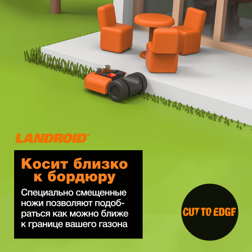 Cut to Edge- новая технология для кошения краев! У роботов Landroid нового поколения, режущая часть смещена от центра к краю, что позволяет скашивать траву максимально близко к границе газона!