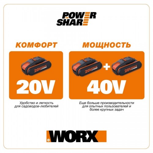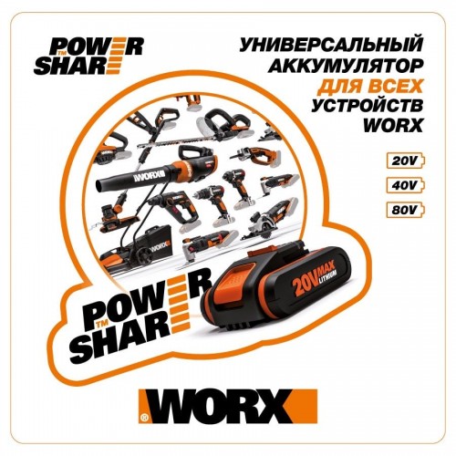 Циркулярная пила WORX WX529 20V работает от универсальных литий-ионных аккумуляторных батарей WORX PowerShare ёмкостью 2 А/ч, 4 А/ч и 6 А/ч. Эти батареи совместимы со всей аккумуляторной техникой WORX PowerShare: с линейками 20V, 40V и 80V.