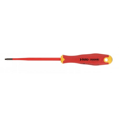 Отвертка диэлектрическая Felo серии E-Slim предназначена для проведения электромонтажных работ с крепежом сечения SQ1 в установках и электрощитах под напряжением до 1000 Вольт.
