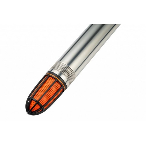 - Внешний съёмный фильтр предотвращает попадание грязи и песка. В случае загрязнения достаточно промыть фильтрующую сетку. Фильтр не случайно имеет форму конуса. Такая конструкция значительно облегчает процесс опускания насоса в скважину при «ступенчатом» соединении обсадных труб.
