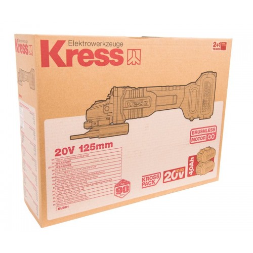 Угловая шлифмашина KRESS KU801 20V работает от универсальных литий-ионных аккумуляторных батарей KRESS KROSS PACK ёмкостью 2 Ач и 4 Ач. Эти батареи совместимы со всей аккумуляторной техникой KRESS KROSS PACK. Для питания техники 20V нужна 1 батарея KROSS PACK 20V.