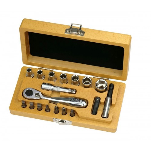 Felo Набор головок и бит с трещоткой и держателем бит в деревянном кейсе предназначен для работы со многими видами крепежа. Состав набора: мини-трещотка 1/4", 7 головок: 5 мм/ 5,5 мм/ 6 мм/ 7 мм/ 8 мм/ 10 мм/ 13 мм/, 7 бит длинной 25 мм и размерами SL 4,5x0,6 / 5,5х1,0/ 6,5x1,2/ PH1/ PH2/ PH3/ PZ2, удлинитель 50 мм 1/4" - 1/4", переходник C 6,3 - 1/4" (25 мм) и битодержатель E6,3 x 58 мм.
