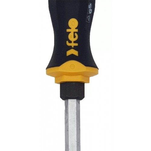 Отвертка Felo шлицевая предназначена для монтажно-демонтажных работ с крепежом сечения SL 8,0. На стержне имеется шестигранная гайка для придания дополнительного усилия ключом.