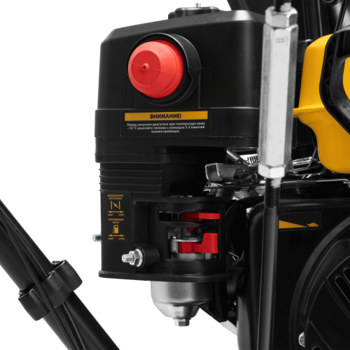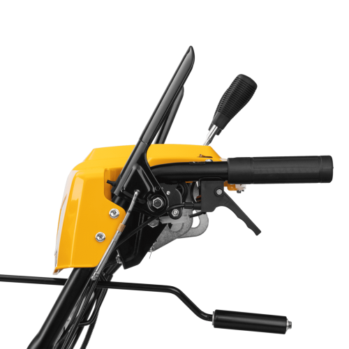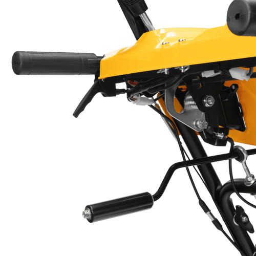 - Управление одной рукой — специальная система позволяет зафиксировать рычаг запуска шнека, пока нажат рычаг привода колес.
