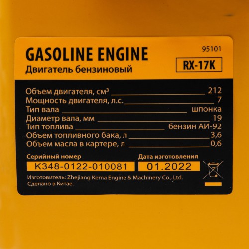 Четырехтактный бензиновый двигатель Denzel RX-17K 95101 мощностью 7 л. с. и объемом 212 см3, с типом горизонтального вала шпонка 19 мм, имеет ручной старт и воздушное охлаждение. Устанавливается на бензотехнику: мотоблоки, садовые измельчители, мотопомпы, виброплиты, мойки высокого давления. Обеспечивает бесперебойное функционирование оборудования и эффективное выполнение сельскохозяйственных, строительных работ, а также решение прочих задач на загородном участке.