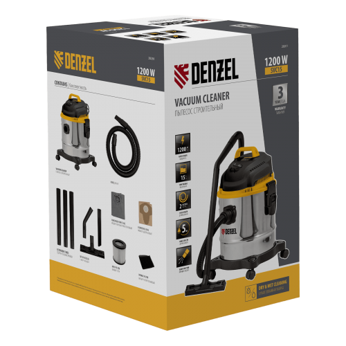 Пылесос строительный DENZEL SVC15, 1200 Вт, бак 15 л, шланг 2 м