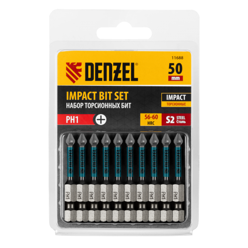Набор бит торсионных PH1 x 50 мм Denzel 11688 с лазерной обработкой шлица, из стали S2, 10 шт., предназначен для монтажа и демонтажа резьбовых соединений с помощью ударного шуруповерта. Он незаменим в строительных, слесарных и монтажных работах, в автосервисах, при проведении ремонта в доме.;Торсионная зона способна пружинить, за счет чего она частично амортизирует тангенциальный удар от шуруповерта. Такое решение позволяет равномерно распределить нагрузку по бите, избежать поломки шлица и в разы увеличить объем работы, проделанный одной насадкой.