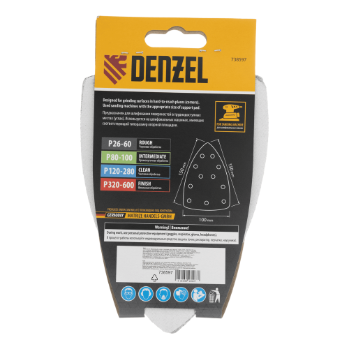 Абразивный перфорированный треугольник на ворсовой подложке «под липучку» Denzel 738597 размером 150 х 150 х 100 мм, 5 шт. в упаковке, имеет зернистость P 80 и предназначен для промежуточной обработки металлических, деревянных и других поверхностей. Позволяет удалять заусенцы, старые лакокрасочные покрытия и ржавчину, удобен для работы в углах и других труднодоступных местах. Треугольник совместим с плоскошлифовальной машиной Denzel 27614, также подходит для установки на другие шлифмашины с размером рабочей платформы 150 х 150 х 100 мм.