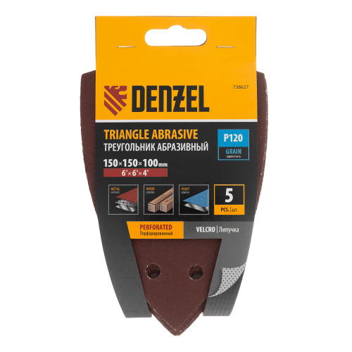 Абразивный перфорированный треугольник на ворсовой подложке «под липучку» Denzel 738627 размером 150 х 150 х 100 мм, 5 шт. в упаковке, имеет зернистость P 120 и предназначен для чистовой обработки металлических, деревянных и других деталей. Позволяет придать поверхности гладкость и подготовить ее к отделкеу, удобен для работы в углах и других труднодоступных местах. Треугольник совместим с плоскошлифовальной машиной Denzel 27614, также подходит для установки на другие шлифмашины с размером рабочей платформы 150 х 150 х 100 мм.