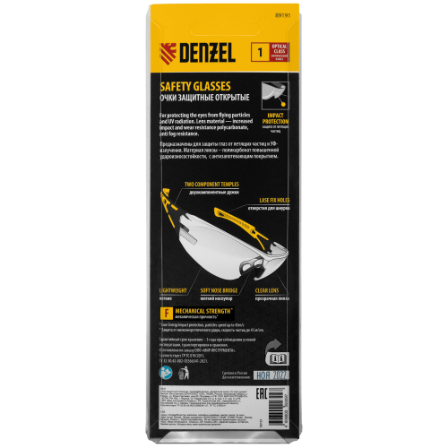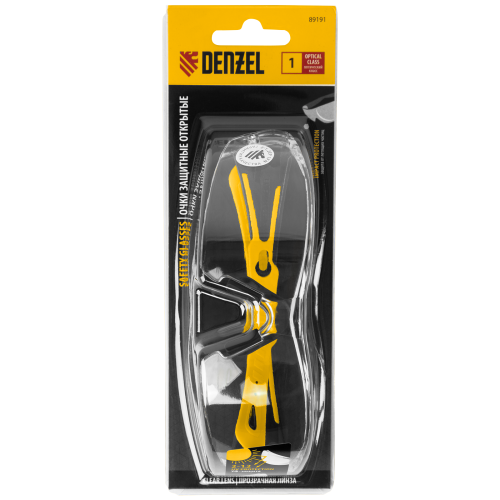 Легкие универсальные защитные очки открытого типа Denzel 89191 с поликарбонатными прозрачными линзами и 2-компонентными дужками предназначены для защиты глаз от механических повреждений и УФ-излучения. Очкам присвоен класс механической прочности F, они обеспечивают защиту от высокоскоростных частиц с низкоэнергетическим ударом V=45 м/с. Очки используются во время работы с электро- и бензоинструментом, на производстве и в быту.