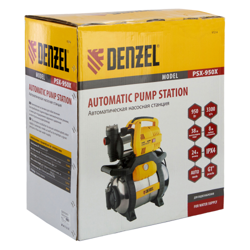 Насосная станция Denzel PSX950X 97214 мощностью 950 Вт и производительностью 3300 л/ч, с ресивером объемом 24 л из «нержавейки», обеспечивает подъем воды на высоту 38 м. Подходит для организации системы водоснабжения в загородном доме. Скорости перекачки до 3300 л/ч достаточно для обеспечения работы нескольких потребителей — в ванной, на кухне и в системе полива. Насосная станция способна выкачивать чистую воду из резервуаров и колодцев глубиной до 8 м. Гидроаккумулятор позволяет снизить частоту включений двигателя, а также обеспечивает запас воды в системе на случай отключения электричества.
