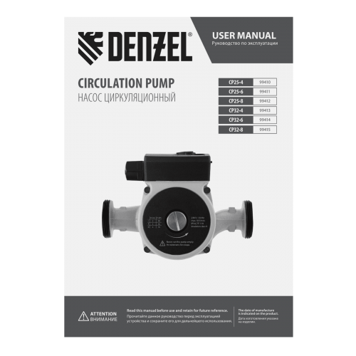 Циркуляционный насос DENZEL CP25-6, напор 6 м, 50 л/мин, 1 м кабель, монт. длина 180 мм