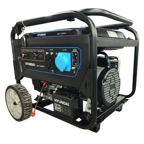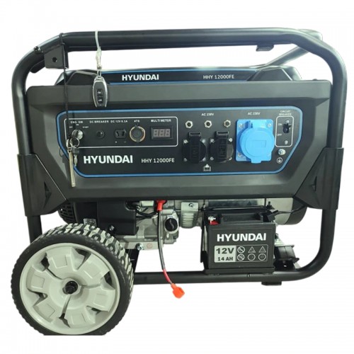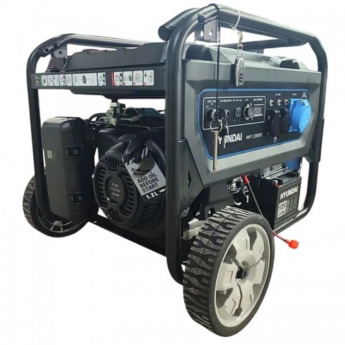 Бензиновый генератор HYUNDAI HHY 12000 FE с максимальной мощностью на выходе до 9,5 кВт переменного тока, напряжения 220 Вольт. Бензогенератор с AVR (автоматический регулятор напряжения). Есть функция электрозапуска с ключа и пульта, от установленного в конструкцию аккумулятора. Время работы на одной заправке при половинчатой нагрузке - до 14 часов. Купить бензогенератор HYUNDAI HHY 12000 FE рекомендуем владельцам загородных домов в качестве резервного источника питания на случай внезапного отключения сетевого электроснабжения. Также бензиновый генератор будет незаменим на строительных объектах в качестве локального источника электроэнергии.