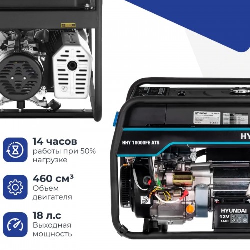Генератор Hyundai HHY 10000FE ATS оснащен четырехтактным двигателем мощностью 18 л.с., который заводится с помощью ручного или электрического стартера. Время работы на полном топливном баке при половинной нагрузке составляет 14 ч. Потребителей электроэнергии можно подключать к силовой розетке или вилке напряжением 230 В на 32 А. Выход постоянного тока напряжением 12 В дает возможность заряжать аккумулятор автомобиля.