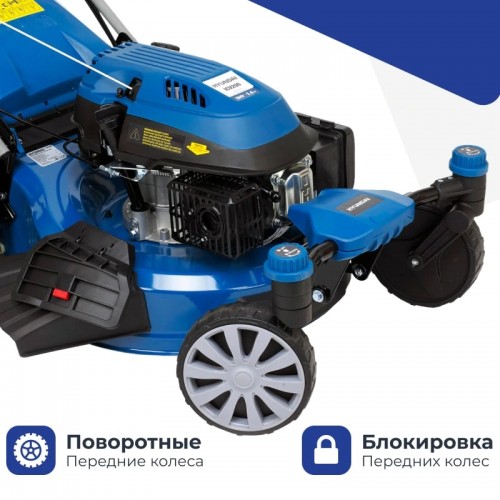 Поворотные колеса повышают маневренность. Вы с комфортом пострижете газоны сложной формы, а также лужайки, на которых есть деревья, клумбы и другие препятствия. При необходимости движения только прямо поворотный механизм колес можно заблокировать.