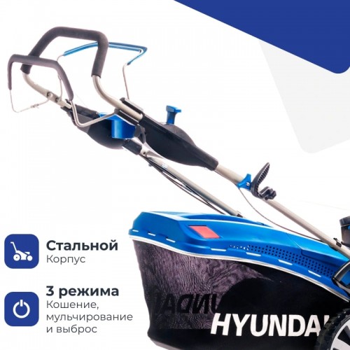 Бензиновая газонокосилка Hyundai срезает траву на высоту от 25 до 75 мм, подходит для газона любого типа. Мощности 5,6 л.с. достаточно для скашивания как тонкой молодой поросли, так и переросших, жестких растений.
