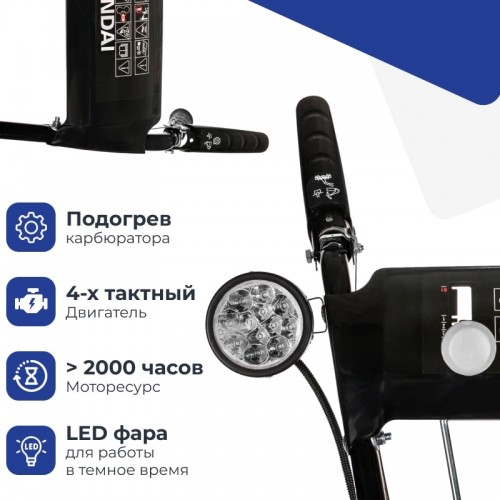 - Светодиодная фара освещает зону уборки и повышает комфорт работы с бензиновым снегоуборщиком Hyundai S 6561. Благодаря яркому освещению машина будет хорошо видна окружающим на большом расстоянии, и вы сможете безопасным образом производить уборку в темное время суток.