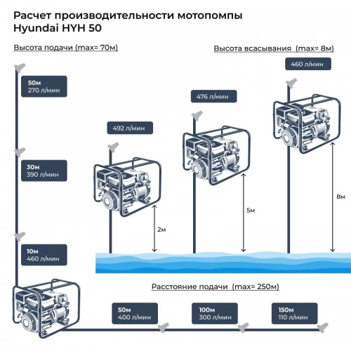 4-тактный мотор мощностью 7 л.с. обеспечивает высокую производительность 500 л/мин. Глубина забора воды составляет 6 м. Высота подъема достигает 70 м. С помощью бензиновой мотопомпы Hyundai HYH 50 вы перекачаете воду на расстояние до 700 м по горизонтали. Двигатель заводится при помощи ручного стартера. Несколько раз вытянув тросик, легко запустить мотор даже после длительного простоя или на холоде.