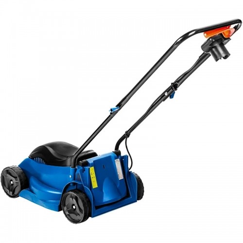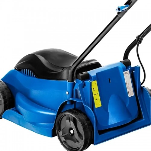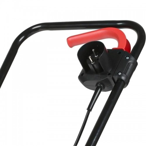 Рабочим инструментом электрокосилки служит нож с загнутыми краями. Такая форма позволяет создать вихревой поток воздуха, приподнимающий стебли растений. За счет этого трава срезается на одинаковой высоте, а газон имеет аккуратный вид. Также это способствует более плотной наполняемости травосборника. Управлять электрогазонокосилкой легко, для включения используется рычаг на основной рукоятке. Для защиты от случайного запуска есть кнопка-предохранитель.