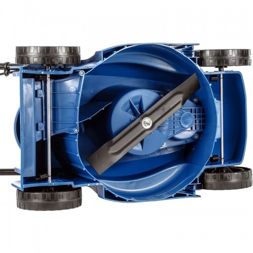 Газонокосилка Hyundai LE 3210 с электрическим двигателем мощностью 1100 Вт работает от бытовой сети 220 В. Высота кошения регулируется установкой передней и задней осей колес в нужные пазы. Высокое качество кошения достигается за счет использования ножа особой формы. Загнутые края лезвий создают вихревой поток, приподнимающий стебли растений. Это обеспечивает ровный срез по всему участку и эффективный сбор скошенной зелени в контейнер.