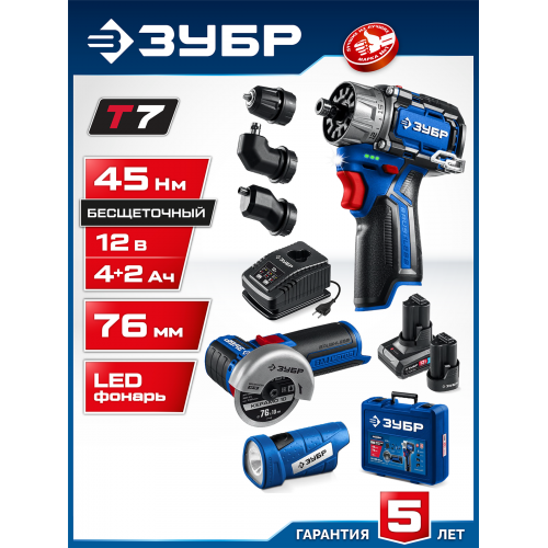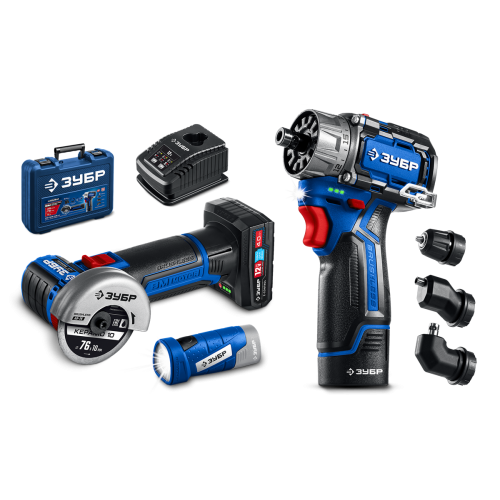 ЗУБР Набор: бесщеточная дрель-шуруповерт КОМБИ, мини УШМ, LED фонарь, 3 насадки-патрона, 2 АКБ (2 А∙ч), кейс, Профессионал (DB-125-42ABF)