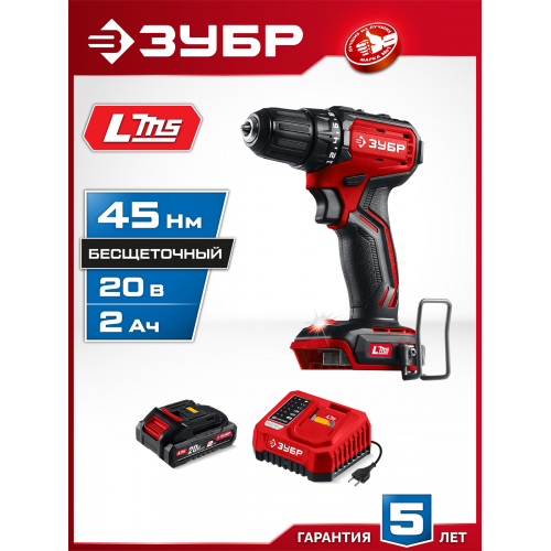 ЗУБР 20 В, 45 Н·м, 1 АКБ LMS (2 А·ч), бесщеточная дрель-шуруповерт (ДБ-45-21)
