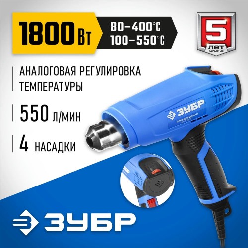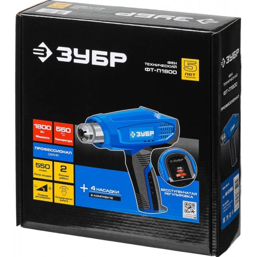 Фен строительный технический ЗУБР ФТ-П1800, предназначен для генерации горячего воздуха, который может быть использован для сушки и снятия лакокрасочных покрытий, для сушки клеевых соединений и клейки путем нагрева, для сушки штукатурки, изделий из гипса и аналогичных материалов. Два режима работы с разной температурой и потоком. Благодаря электронной регулировке температуры и потребляемой мощности возможна работа с различными материалами. Ступень холодного обдува позволяет охладить нагревательный элемент по окончании работы. Схема воздушного потока увеличивает КПД фена. Увеличенные диаметры нагревательных нитей исключают перегорание. 4 различные насадки в комплекте позволяют выполнять любую работу – от точечного нагрева до сушки больших площадей. Термопредохранитель для защиты изделия и нагревательного элемента от выхода из строя из-за перегрева. Специальный упор на рукоятке позволяют использовать фен в стационарном положении. Конструкция воздушных каналов предотвращает попадание в фен крупных частиц.