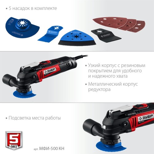 Реноватор с набором насадок ЗУБР МФИ-500 КН, предназначен для резки, пилки, шлифовки заготовок из дерева, металла, керамики, пластика и т.д. Большой угол колебаний 3.2 градуса в сочетании с широким спектром регулировки частоты обеспечивают эффективную работу с любым материалом. Эргономичный дизайн, благодаря чему инструмент удобно лежит в руке. Патрон универсальной системы для насадок с хвостовиком OQIS/OIS. Электронная регулировка частоты колебаний позволяет подобрать оптимальный режим для каждого вида работы и материалов. Комплект наиболее востребованных насадок для начала работы сразу после покупки. Подсветка для работы в условиях ограниченного освещения. Удобный кейс для хранения и переноски.