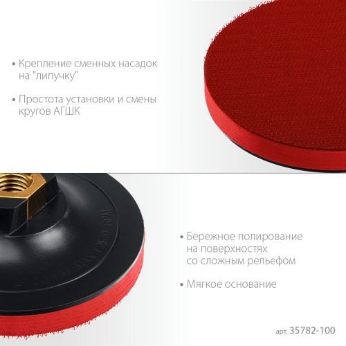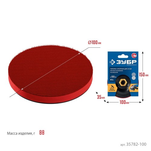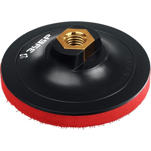 Тарелка опорная ЗУБР 35782-100, применяется для фиксации оснастки с велкро-основой на УШМ при выполнении шлифовально-полировальных работ. Усиленная фиксация на прижимную шайбу М14. Повышенная стойкость к перегибу и деформации. Полиуретановая вставка обеспечивает бережное шлифование поверхностей со сложным рельефом. Максимальная частота вращения до 12500 об/мин.